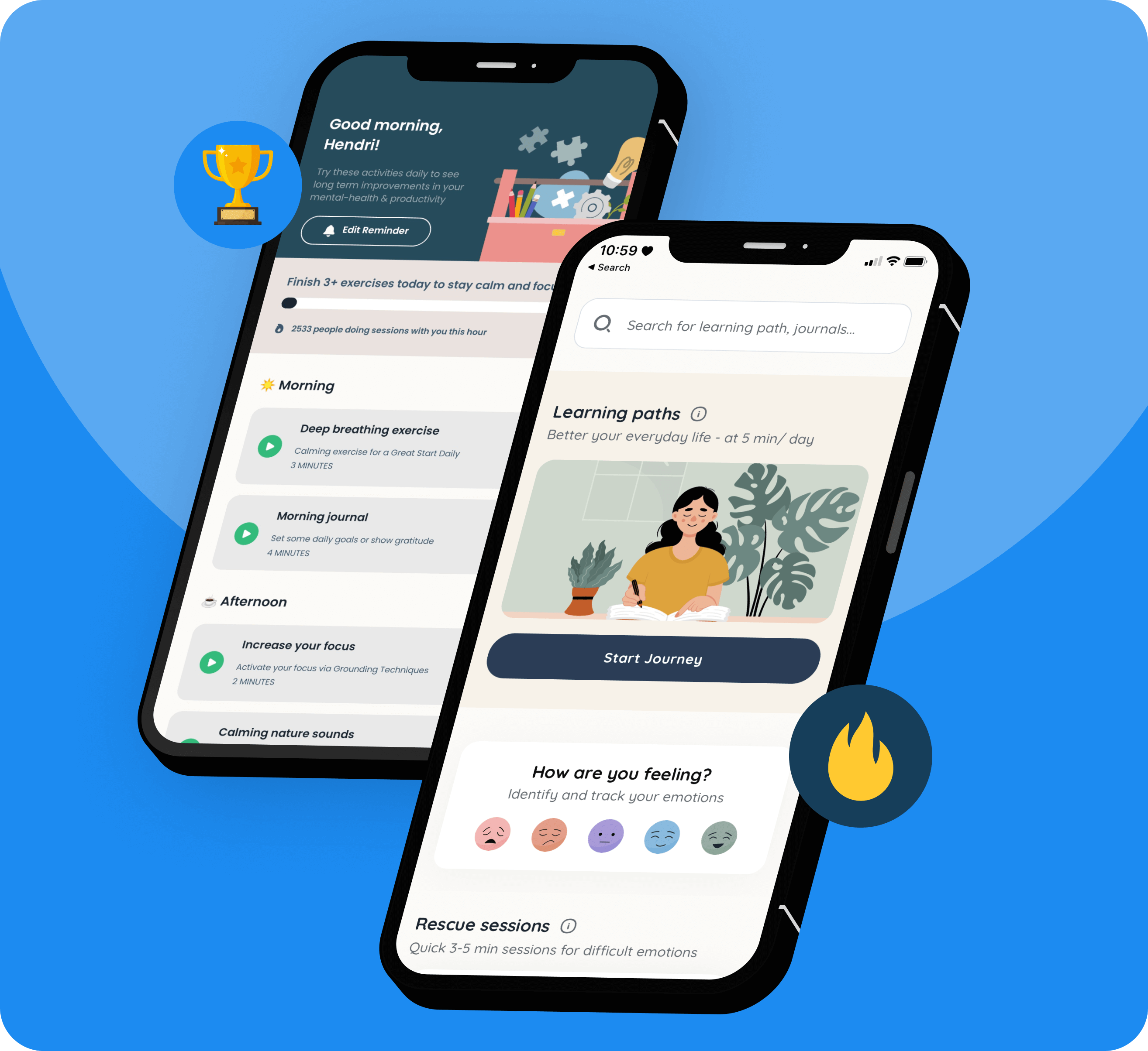 - Self-guided tools, including Learning Paths, Rescue Sessions, Guided Journaling, Guided Meditations, and more